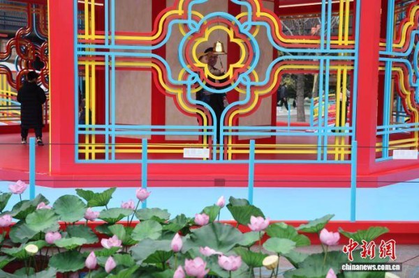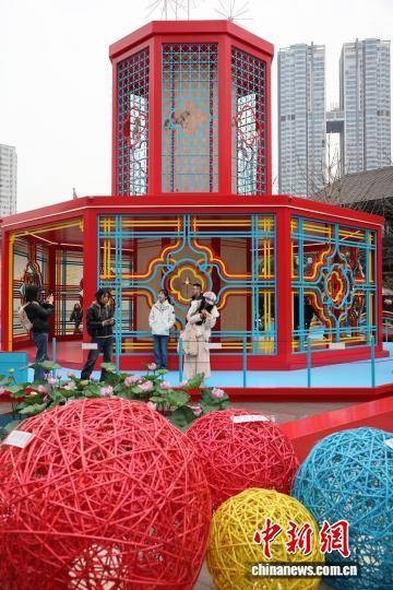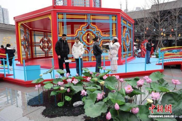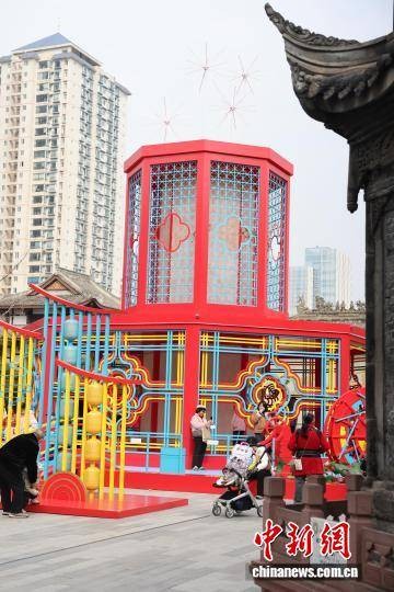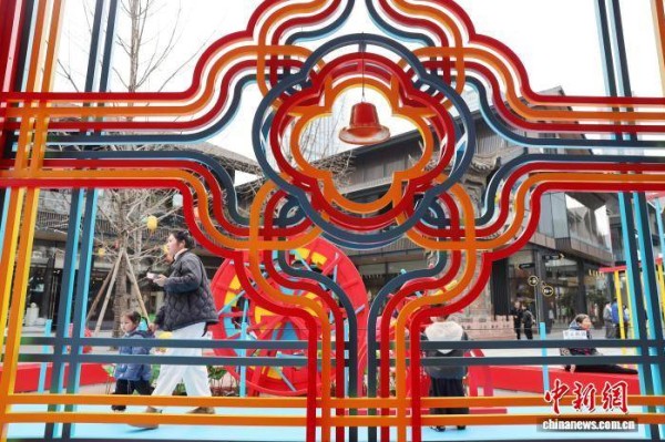 四川成都:融合走马灯、中国结元素的大型装置亮相街头