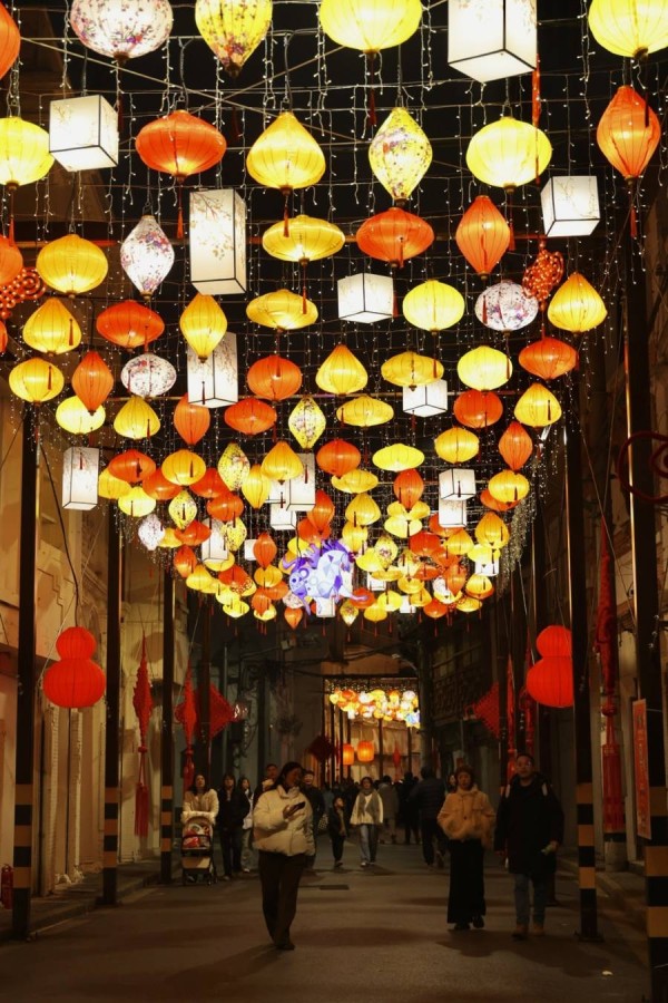 新春氛围同步蔓延至街区。外滩枫泾路化身为一条璀璨的“国风灯影长廊”,在渐变柔和的灯光下营造出一片可漫步赏灯的诗意氛围;BFC上街沿,IP的萌趣世界悄然降临,各式点金奔腾灯组错落分布,将整片街区的烟火气浸润在可爱与温暖的氛围之中。