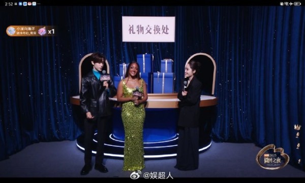 今天红毯上为歌手米奇·盖顿当翻译,在交换礼物环节帮忙和主持人沟通,完全是一个人打两份工来的