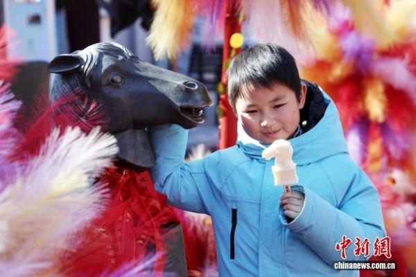 2月7日,北京,2026年圆明园新春游园会开幕。游园会融合了手作体验、国画展览、非遗市集等多元活动,为市民和游客打造沉浸式新春文化盛宴。?图为小朋友手持马首冰淇凌与海棠书院内的马首雕像合影。中新社记者 王紫儒 摄
