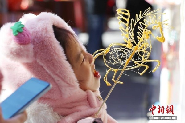 2月7日,北京,2026年圆明园新春游园会开幕。游园会融合了手作体验、国画展览、非遗市集等多元活动,为市民和游客打造沉浸式新春文化盛宴。图为小朋友品尝马形状的糖画。?中新社记者 王紫儒 摄