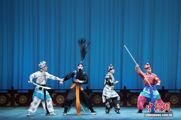 图为2月7日,刘恒(左二)演出《施公案·洗浮山》。图/CNSphoto 史春阳 摄