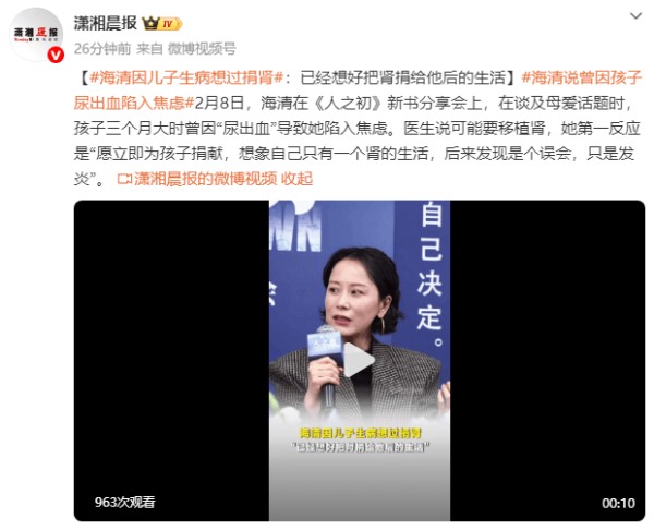 2月8日,海清在《人之初》新书分享会上,谈及母爱话题时,表示孩子三个月大时曾因“尿出血”导致她陷入焦虑情绪中。医生说可能要移植肾,她第一反应是“愿立即为孩子捐献,想象自己只有一个肾的生活,后来发现是个误会,只是发炎”。