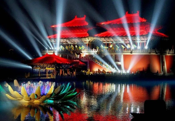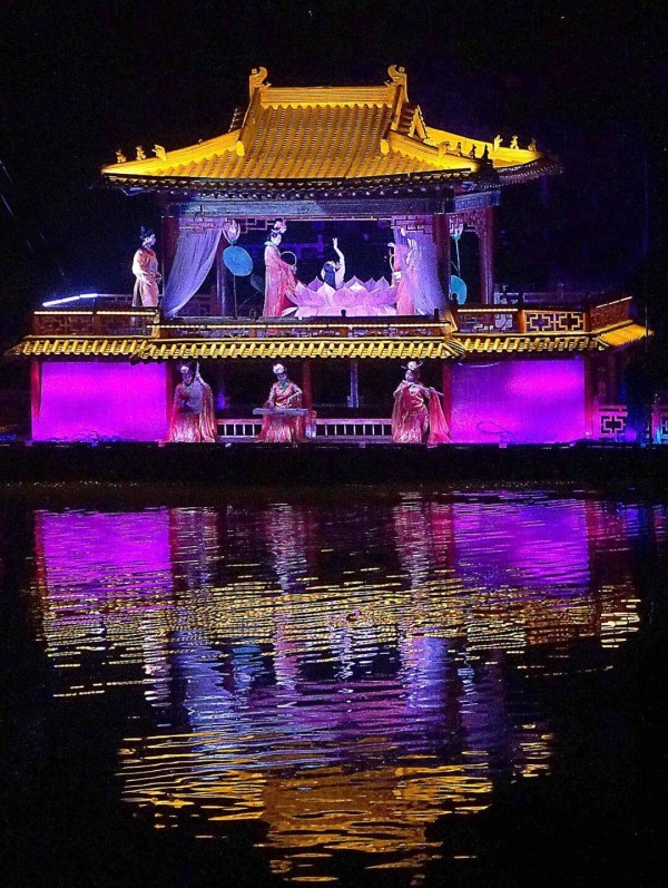 演员们在开封清明上河园景区内演绎大型水上实景演出《大宋·东京梦华》。新华社记者李安摄