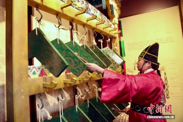 2月9日,天坛公园神乐署开放暨中和韶乐展览开幕式在北京举行。据悉,历经修缮和展陈提升,北京天坛神乐署院落将于10日对公众重新开放。天坛公园在神乐署布设“天坛神乐署中和韶乐展”,以1500平方米展览空间展示礼乐文化。中和韶乐是明清两朝用于祭祀天地、祖先等重大国事活动的专用礼仪性音乐,贯穿整个典仪过程,融礼、乐、歌、舞为一体,是中国雅乐传统的重要组成部分。天坛神乐署始建于明永乐十八年(1420年),是明清两代演习祭祀礼乐的核心场所。作为天坛五组建筑群之一,神乐署承载着中华礼乐的千年文脉。图为工作人员展示编磬。中新社记者 易海菲 摄