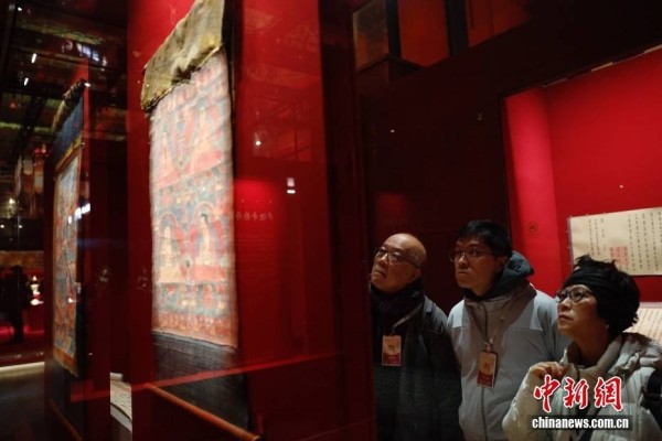 2月9日,由故宫博物院联合西藏自治区文物局等多家文博单位共同举办的“万法归一:萨迦寺历史文化与艺术”展在北京故宫博物院开幕。展览精选200余件珍贵文物,以“萨迦寺的历史”“九州一统”“萨迦时代的文化与艺术”“萨迦派的珍藏”四个单元,展现萨迦寺近千年的历史积淀、艺术特色,及其在中华民族多元一体进程中的重要作用。图为嘉宾参观展览。中新社记者 韩海丹 摄