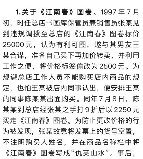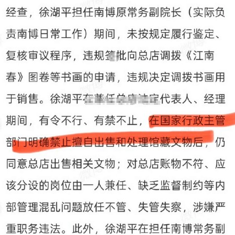 上世纪90年代,经南博当时的常务副院长徐湖平违规签批,原省文化厅又未按规定严格审核,就违规批复同意,南博将《江南春》图卷等5幅书画违规调拨原省文物总店进行了销售;