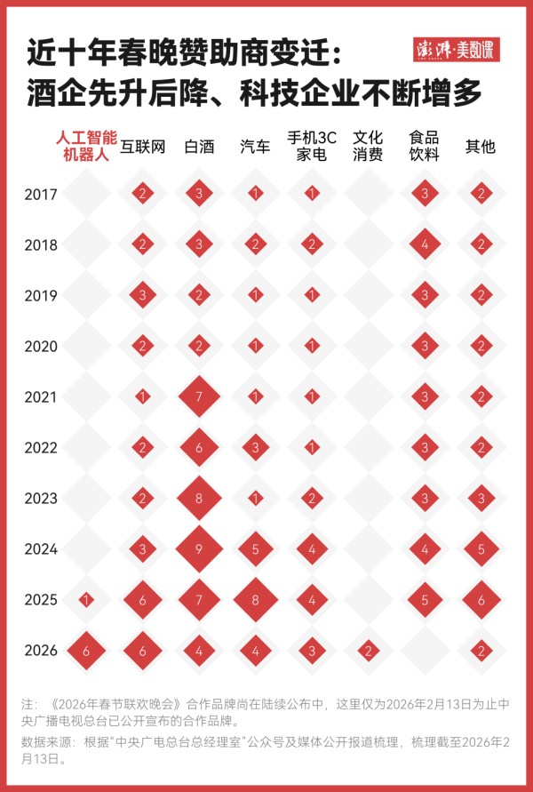 根据澎湃美数课工作室的不完全统计,截至2月13日,中央广播电视总台《2026年春节联欢晚会》(以下简称总台春晚)已官宣的合作伙伴达到了27家,既有传统消费企业,也有互联网大厂。近年来,总台春晚的合作赛道愈加丰富,从电商到视频弹幕,从笔记互动社区到AI云等诸多类目。