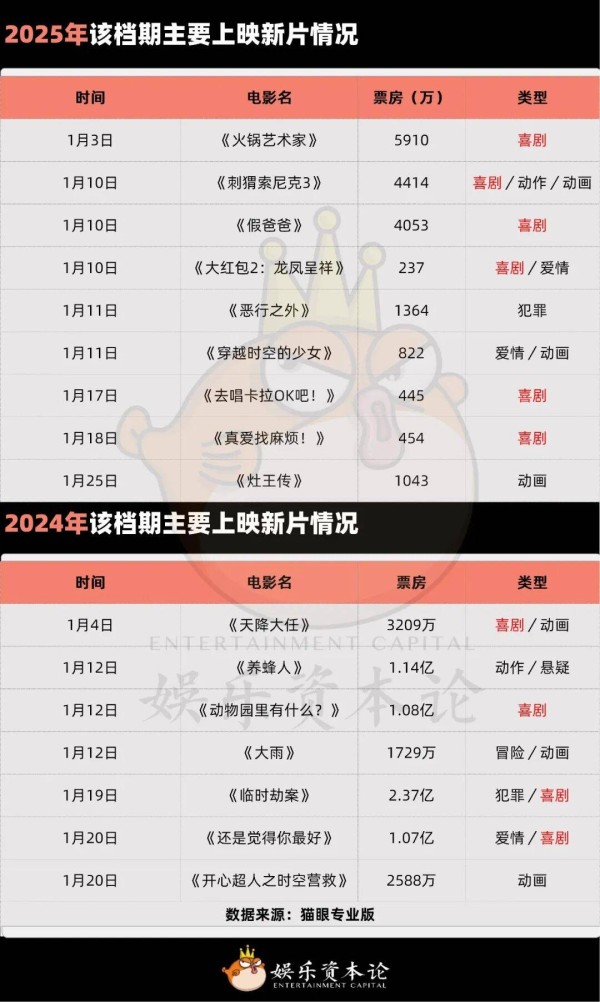 娱乐资本论观察发现,最近几年经过市场的持续摸索,这个覆盖寒假前段的观影周期,凭借精准的受众定位与灵活的题材布局,逐渐成为中小成本影片实现突围的重要窗口,并沉淀出一套清晰的题材偏好与宣发策略。