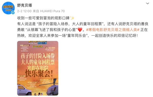 动画片《舒克贝塔之微缩人类》主打“寒假亲子观影”,兼顾了儿童对动画的喜好与家长的怀旧需求。