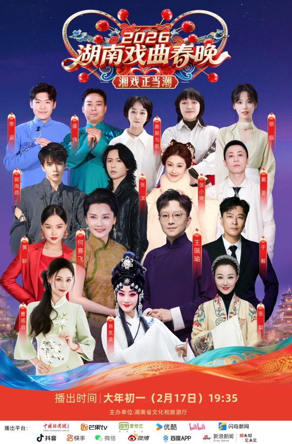 《2026湖南戏曲春晚》是一次跨界融合的勇敢尝试,一场传统戏曲的青春化转译,更是一幅薪火相传的艺术长卷。2月17日(大年初一)19:35,晚会将通过芒果TV、爱奇艺、优酷、哔哩哔哩、抖音、快手、视频号、微博、百度、新浪新闻客户端、新湖南客户端、闪电新闻客户端等网络平台及山东卫视和甘肃卫视播出。诚邀您共赴这场湘音缭绕的新春之约,见证“湘戏正当潮”的独特魅力。