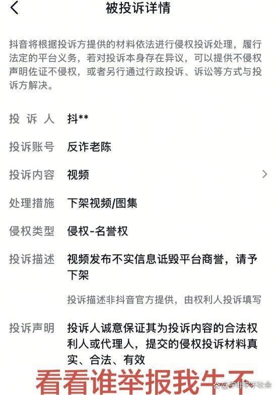 平台给出的举报理由也十分充分:反诈老陈的部分视频,涉嫌诋毁平台商誉,请求平台下架相关视频。看到这,不少网友都笑了:原来平台内部也是 “各管一摊”,电商归电商、视频归视频、审核归审核,老陈的喊话,大概率是触动了平台电商板块的利益,才被自己赖以生存的平台 “反手举报”。