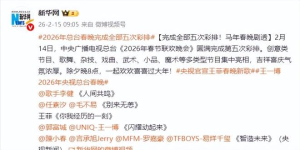 新华网报道了王菲将再次登上春晚的消息。2月124日中央广播电视总台圆满完成了2026年春节联欢晚会的第五次彩排。而这一次的彩排也随即曝光了一些参与演出的节目。其中,歌手李健的《人间共鸣》属于央视春晚的首发歌曲。除了李健之外,毛不易和任素汐带来了歌曲《别来无恙》,郭富城、王一博合唱歌曲《闪耀动起来》,陈小春、易烊千玺等人合唱歌曲《智造未来》