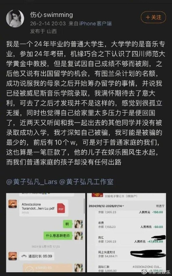 一网友称,歌手黄子弘凡爸爸诈骗学生,打着“内部名额、保录取”的旗号,收取巨额费用,但不办事。