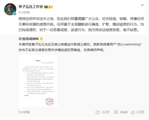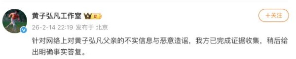 随后,黄子弘凡工作室发文回应:针对网络上对黄子弘凡父亲的不实信息与恶意造谣,我方已完成证据收集,随后发出律师信回应相关指控。
