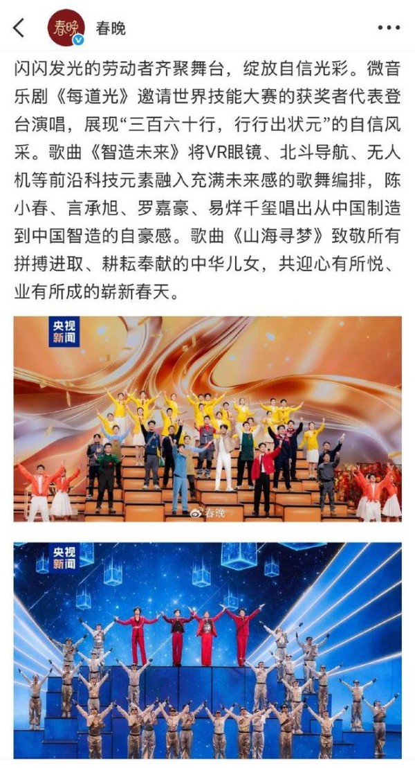 根据彩排信息,易烊千玺此次将与陈小春、言承旭、罗嘉豪共同演绎科技主题歌舞《智造未来》。节目将VR眼镜、北斗导航、无人机等硬核科技元素融入充满未来感的舞台,旨在唱响从“中国制造”迈向“中国智造”的时代自豪感。