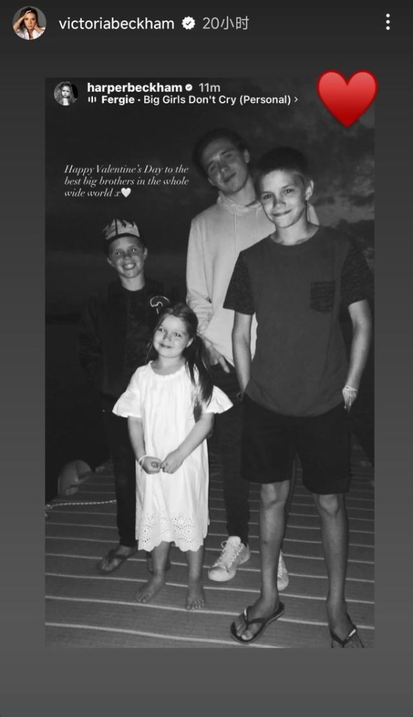 2月14号,贝克汉姆的女儿小七晒出四兄妹合照,并配文:“祝全世界最好的哥哥们情人节快乐”。其中一张照片里,兄妹四人还是孩子模样,老大布鲁克林双手插兜很有大哥风范,小七的个头刚到他的腰,像个小公主一样被三个哥哥护在中间。