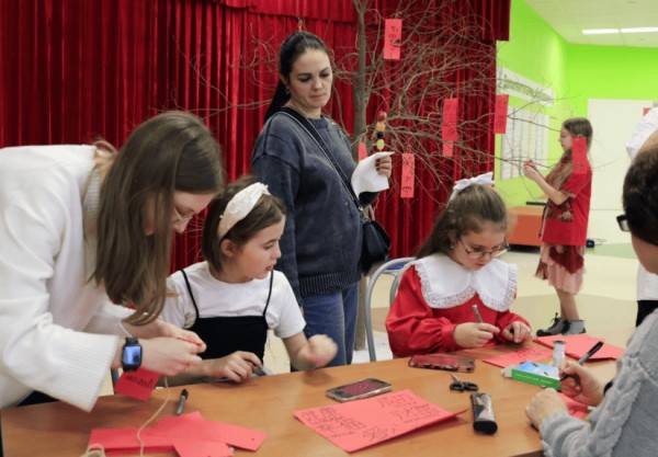 当地时间2025年2月8日,中国春节庆祝活动在莫斯科548学校举行。图为俄罗斯小学生制作中文祈福卡。 中新社记者 田冰 摄