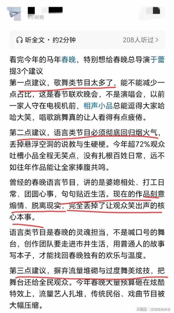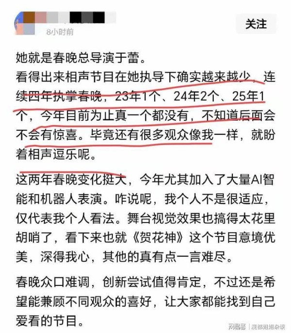 所以,不必再抱怨为什么小品和相声越来越少,也不必再指责春晚导演的水平如何。春晚的导演并非独立的创作者,她只是一个执行者,整台晚会要表达的核心信息,最终还得由上层拍板决定。你要怪,也只能怪以前的小品相声演得太好,太真实,真实到触及了敏感的神经,真实到最终被遗弃的地步。 春晚的质量如何,终究是观众的选择。如果你觉得好看,那就多看;如果你觉得不好看,那就不看。毕竟,在这个新时代的背景下,春晚作为一场全球盛会,传递的信息和以前已截然不同,这也是一种时代的进步,和社会变迁的必然反应。以上仅是我的个人看法,真理与否,各位见仁见智。