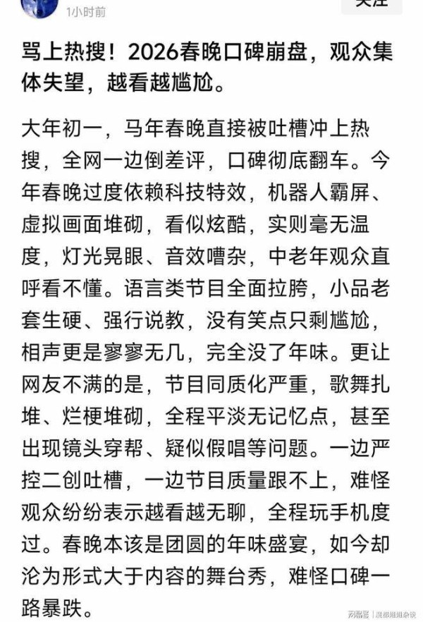 别再拿收视率高来作为辩解了。过年那会儿,谁不是在家里一整天把电视当作背景板打开的?这样就可以自我安慰了?话说回来,这样的大国,最不缺的就是人才。春晚这道大餐再难做,也一定有人能做好,关键是要让能干的人来做。庸者下,能者上,这样的全球直播的晚会连这点都做不到吗?网友们的建议倒是把我逗乐了:实在不行,让河南春晚导演组来试试?如果还不行,那就轮流让几大卫视一年办一次,互相比一比;再不行,找辉哥上去吧,我们真的看不下去了。说得真是有道理,你们觉得呢?