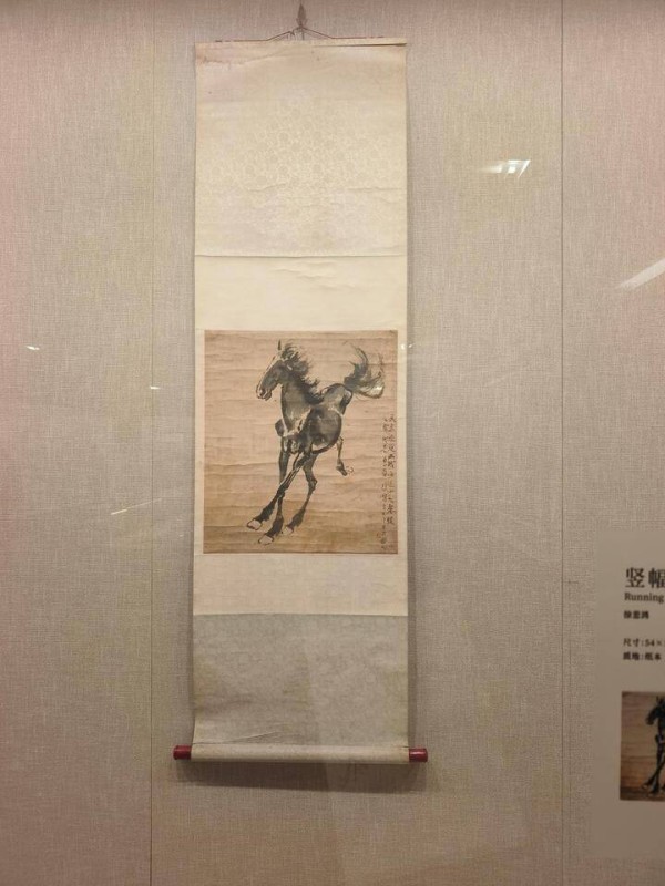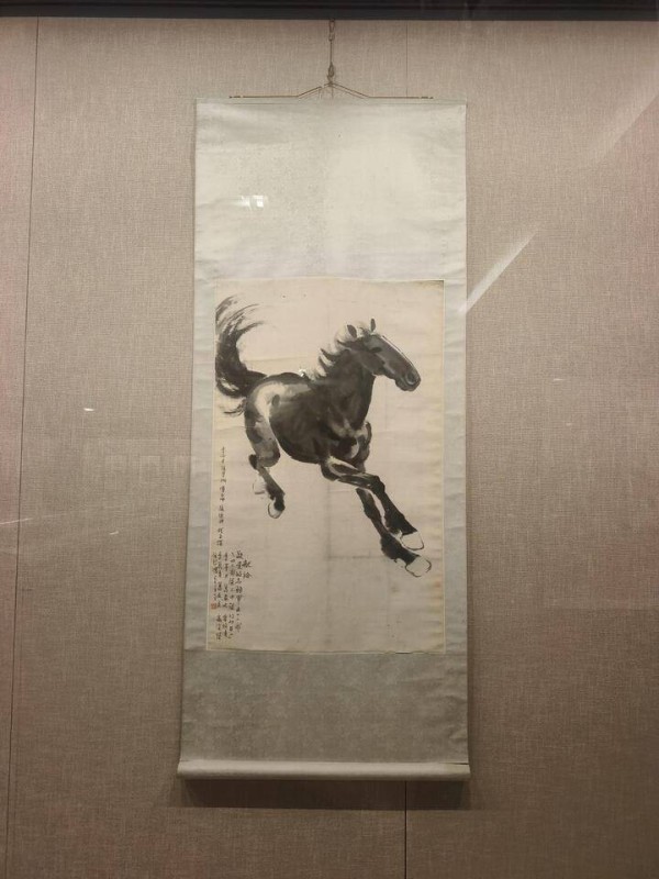 宜兴市美术馆副馆长杨素璞介绍,馆中的“镇馆之宝”是三幅“马”的真迹,分别代表徐悲鸿艺术生涯中早中晚期三种不同的风格。第一幅《横幅奔马》是早期作品,“马”的姿态轻盈愉悦、朝气蓬勃。第二幅《竖幅奔马》,是徐悲鸿在1937年左右所作,此时正值抗战最为艰难的时刻,也是徐悲鸿创作力鼎盛时期。画面上,一匹铮铮傲骨的“战马”跃然纸上,虽然体格精瘦,却精神勃发,仿佛随时要奔赴战场。第三幅《献志愿军奔马》创作于1953年,上书“献给敬爱的志愿军五十二部六四〇部队二中队的功臣……”,“马”的笔墨纯熟、神韵聚拢、步履刚健,展现出“雄赳赳气昂昂”的必胜信心。