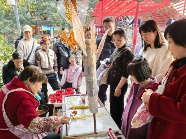 除了糖画,古镇内一根面、石磨豆花等传统小吃同样生意红火。街头巷尾,游人纷纷举起手机记录。千年古镇正以最地道的传统年俗,让八方来客沉醉在这浓浓的巴蜀年味之中。
