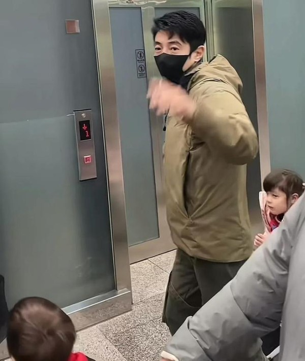他身着墨绿色轻量羽绒外套,佩戴纯黑医用口罩,肩背一款深灰双肩包,左手稳推满载行李的拉杆车,右手始终轻握女儿的小手,目光专注而柔软,寸步不离,俨然一位经验十足的“生活型奶爸”。