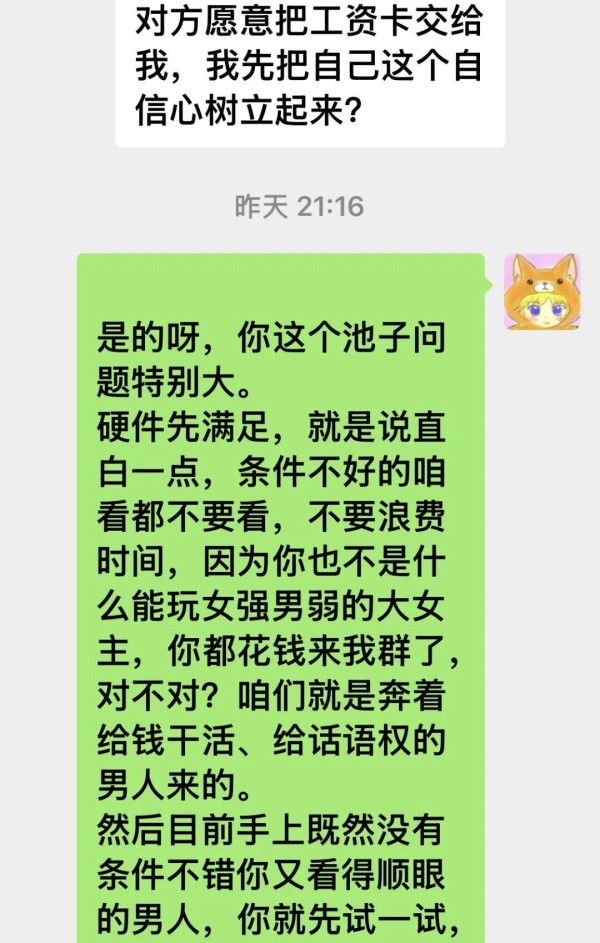 我确实觉得婚姻是二次投胎,能够找个给钱干活给话语权的老公,这辈子已经过了及格线了。