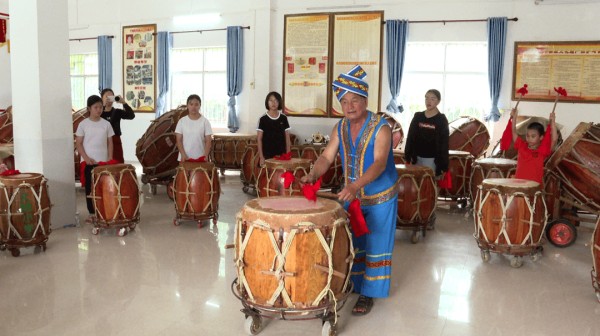 国家级会鼓非遗传承人 韦建廷:在传承方面,我首先是组织一个会鼓队,当好一个指导老师的角色。第二个是深入学校传承,传授给大中小学的学生。