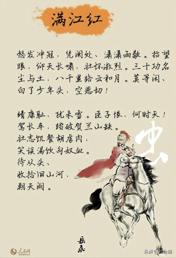 怒发冲冠,凭阑处、潇潇雨歇。抬望眼,仰天长啸,壮怀激烈。三十功名尘与土,八千里路云和月。莫等闲、白了少年头,空悲切。靖康耻,犹未雪。臣子恨,何时灭。驾长车,踏破贺兰山缺。壮志饥餐胡虏肉,笑谈渴饮匈奴血。待从头、收拾旧山河,朝天阙。
