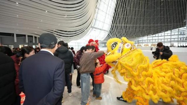 为了让游客拥有更沉浸的体验,舞狮和财神爷惊喜“亮相”在市集内。财神爷将饱含新年祝福的“金币”分发给入市的游客,一声响亮的“新年快乐”让游客喜笑颜开。舞狮憨态可掬,在集市间穿梭,来往的观众纷纷互动,并拍照留念。