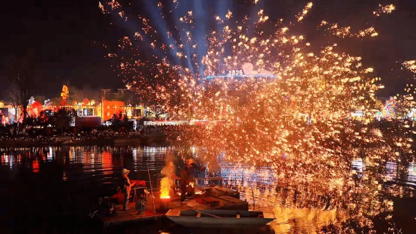 夜色渐浓,园区非遗打铁花表演随之登场。滚烫的铁水被匠人奋力击打,凌空挥洒间化作漫天“金雨”,火树银花在夜空璀璨绽放。“这是我第一次现场看打铁花,太壮观了!”站在人群前排,目不转睛盯着表演的学生小吴激动地说。游客们纷纷举起手机,定格这震撼瞬间,惊叹声与打铁花的声响交织,将元宵之夜的氛围推向高潮。