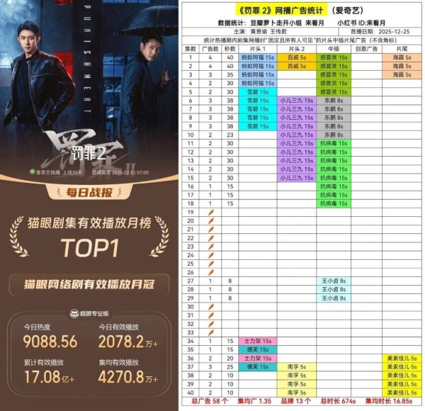 悬疑题材的境况更恶劣,典型的市场热度和招商不成正比。《罚罪2》登顶猫眼1月有效播放榜首、爱奇艺站内热度破万,但13个品牌合作、裸播12集的招商成绩实在表现一般;《人之初》虽有15个品牌合作,但明显得益于制作班底和演员阵容。而这已经是今年至今悬疑剧的“巅峰”了。