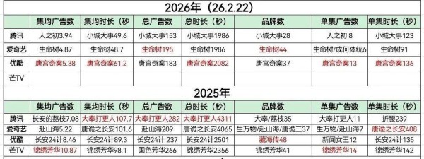 《生命树》以44个合作品牌成为爱奇艺新史冠,位居全平台独播剧合作品牌数第二名;《唐宫奇案》以单集13广刷新优酷平台记录,位居全平台独播剧单集广告数第二名……两个单平台史冠、全平台史亚,长剧招商春景正好。这也是继2024年之后,剧集市场再度出现“市场不热、招商火热”的强反差。