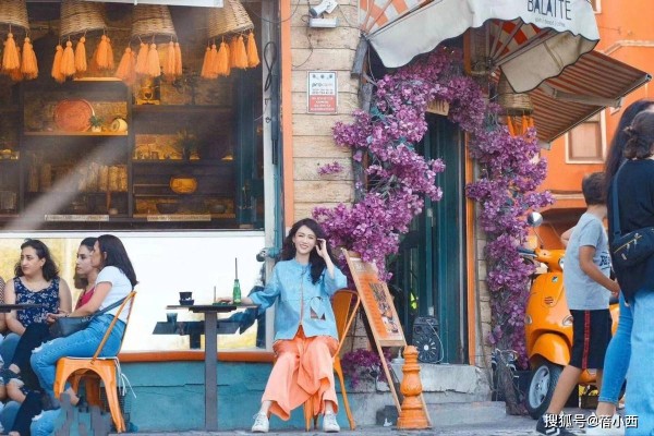 她的发型也很有少女感,侧编发上别着一朵小白花,瞬间增添了甜美的氛围,和背景色彩浓烈的涂鸦墙形成“柔与刚”的视觉对比,温柔又有记忆点。她站在墙前,笑容松弛又明媚,没有用力凹造型,却把度假的惬意感拉满。