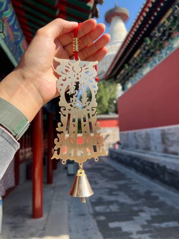 以华鬘风铃为例,顾莹介绍,它的外观设计灵感来源于白塔华盖36片华鬘的纹饰,而风铃上的“圣寿万安”几个字,来自白塔寺最早的名字——元代的圣寿万安寺。