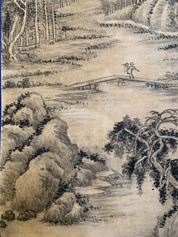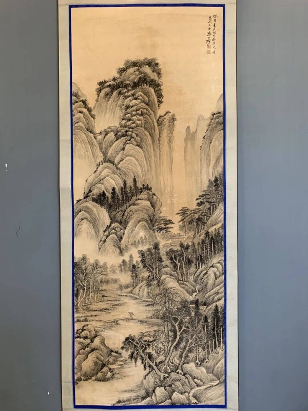 张大千这轴“仿大痴道人法”的山水画,乍一看是老实临古,细品全是“小心机”!大痴道人就是元代黄公望,他画山水爱用“披麻皴”,线条像麻绳一样细密,专治各种山石纹理。张大千这画里,山体轮廓用浓墨勾得硬气,皴法却学黄公望的“披麻”,但没照搬——他掺了董源的“雨点皴”,密密麻麻的短笔,像山体被雨水砸出的坑,远看是黄公望的温润,近看又多了份厚重,活脱脱“古法新穿”!