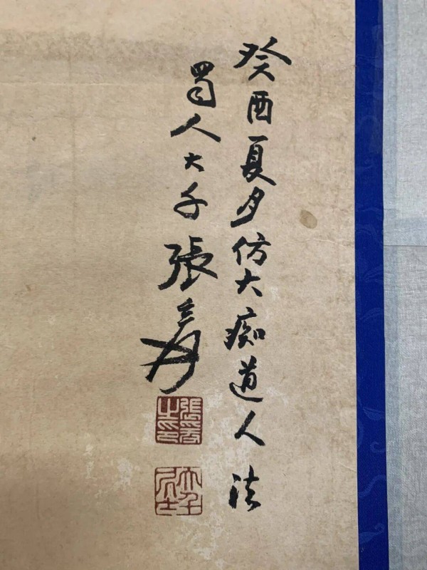 最妙的是题款——“仿大痴道人法”,张大千没藏着掖着,但落款位置偏右上角,像故意留白,让观者视线先被山吸引,再顺着题款往上走,最后停在空白处,仿佛在说:“古法是根,但我的画,得你自己品!”这哪是“仿”?分明是借古人的壳,装自己的新酒,喝着是黄公望的味,回味却是张大千的劲儿!