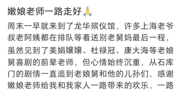 我八点一刻到门口,告别大厅十点才开,黑衣的人已经绕了两圈,有人捧着白菊,有人抱着旧版《老娘舅》录像带,说是想让她听见熟悉的笑声。旁边一位大姐穿着全黑的旗袍,她悄悄对我说,早上没来得及吃饭,嘴里只含了一颗糖,怕在队伍里晕倒了给添乱。