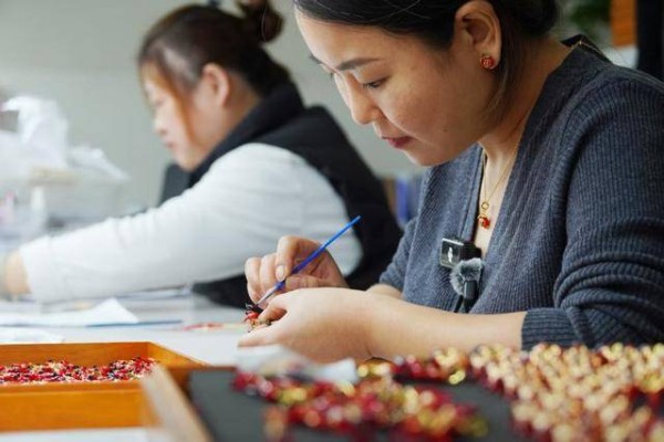 张淑凤在给珐琅饰品上色