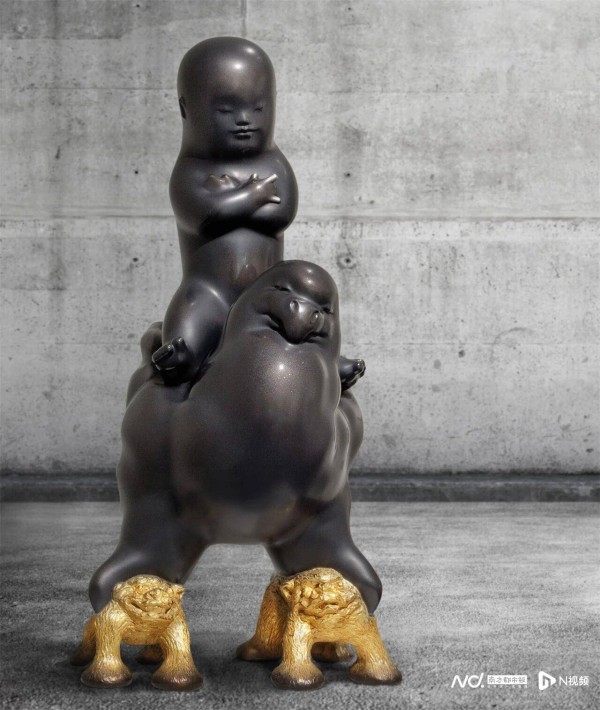李真:这个系列的核心,我想表达的是一种“优雅中的矛盾”。以作品《十足·乘胜》为例——人物比出一个摇滚手势,带着几分叛逆与酷感,是很当下的语言;而底座却是一头狮子,象征着东方文化里关于财富、守护与安定的意象。一古一今,一动一静,碰撞在一起,矛盾就这样产生了。