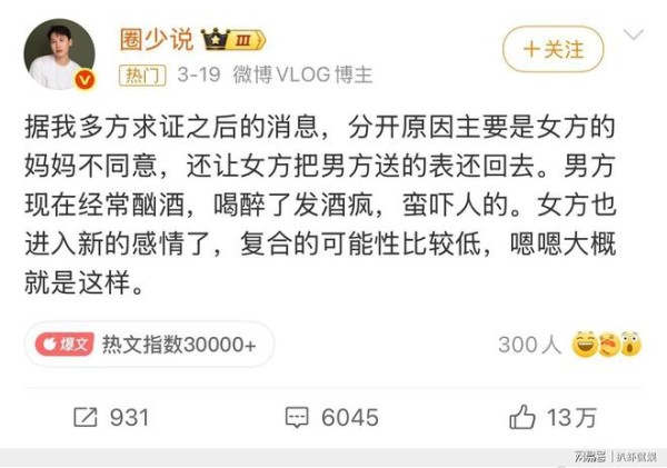 据博主表示,他是经过多方求证后才得到的消息,分手的主要原因是女方的妈妈不同意,还让女方把男方赠送给她的表还回去。