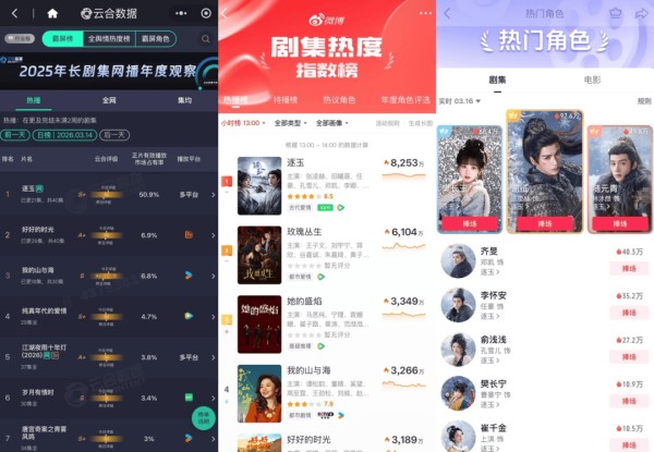 这些指标分属不同平台、不同受众和不同计算逻辑,数据衡量的是完全不同的反馈机制——有用户追剧行为,有市场份额变化,有角色出圈能力,对演员表现的喜好评价。