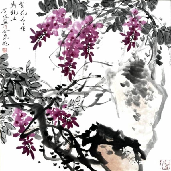“他的紫藤以笔墨为核心,笔势苍劲多变,浓淡、虚实、软硬随心运化,配花缀叶层次丰赡、气韵生动。紫藤的藤本结构,本身就是对书法线条的极致考验,起笔需有篆隶的沉雄骨力,行笔需有行草的灵动韵律,墨色变化需尽得‘墨分五色’的传统妙谛,一笔下去,既是书法也是绘画,既是物象也是心性,李俊把这个难度极高的载体彻底吃透了。”孙克精准解析其笔墨美学的学术价值:“以书入画是中国画的灵魂,李俊以篆隶笔意写藤、以行草意趣点花,线条有骨力、墨色有韵致,把传统笔墨的精、气、神写活了,这是数十年临池不辍、潜心积淀的真功夫,更是对中国画笔墨本体论的深度践行。他以笔墨为根本建构了完整的个人语言体系,完成了从题材深耕到学术创新的跨越,为当代花鸟画‘一题精研’的创作路径,提供了极具参考价值的学术范式。”