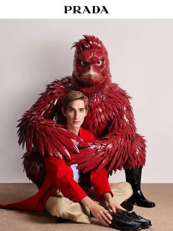 近日,意大利奢侈品牌Prada发布了2026春夏广告大片。画面中,一众超模等出镜明星与一只巨型鸟类生物同框——这只鸟拥有逼真的羽毛质感和犀利的眼神,时而从背后环抱模特,时而俯身贴近,氛围诡异而迷离。