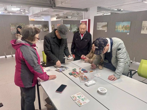 爷叔、阿姨们正在拓印明信片