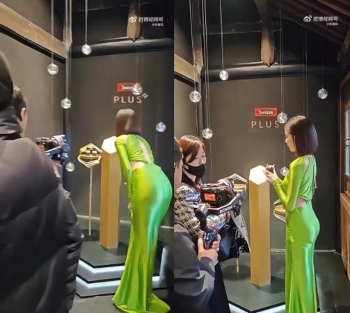 影片中,宋妍霏身穿萤光绿的紧身长礼服,身材凹凸有致。不过,在她转过身等着工作人员帮忙拿产品时,臀部却被部分网友质疑「这是穿了假臀垫子吧」、「侧面一眼假垫子」,掀起讨论。