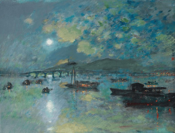 1960年的《黄浦江夜航图》,他以凝重和谐的色彩描绘皓月下风平浪静的黄浦江夜间航运景象。