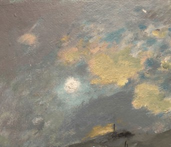 在这一版的《石湖串月》中,90岁的颜文樑运用大量的油彩,让浮云与夜幕挣脱形体束缚。月色朦胧中,水天相接处全是流动的情绪。他将粉绿、草绿、深绿糅合以表现浮云,用普兰、群青、钴兰、湖兰、青莲等颜色,以点块状的笔触渲染夜幕。画面中的渔船上还泛着的点点红光,远处的行春桥清晰可辨。颜文樑用色彩张力,把对故乡和艺术的热爱藏进每一笔。