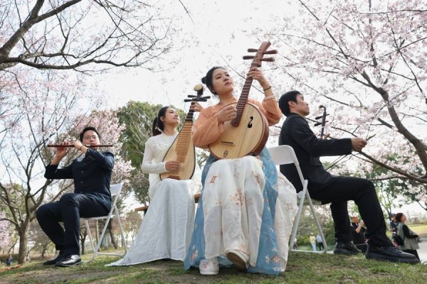 在顾村公园的樱花树下,民乐演奏者在为市民游客演奏江南丝竹。
